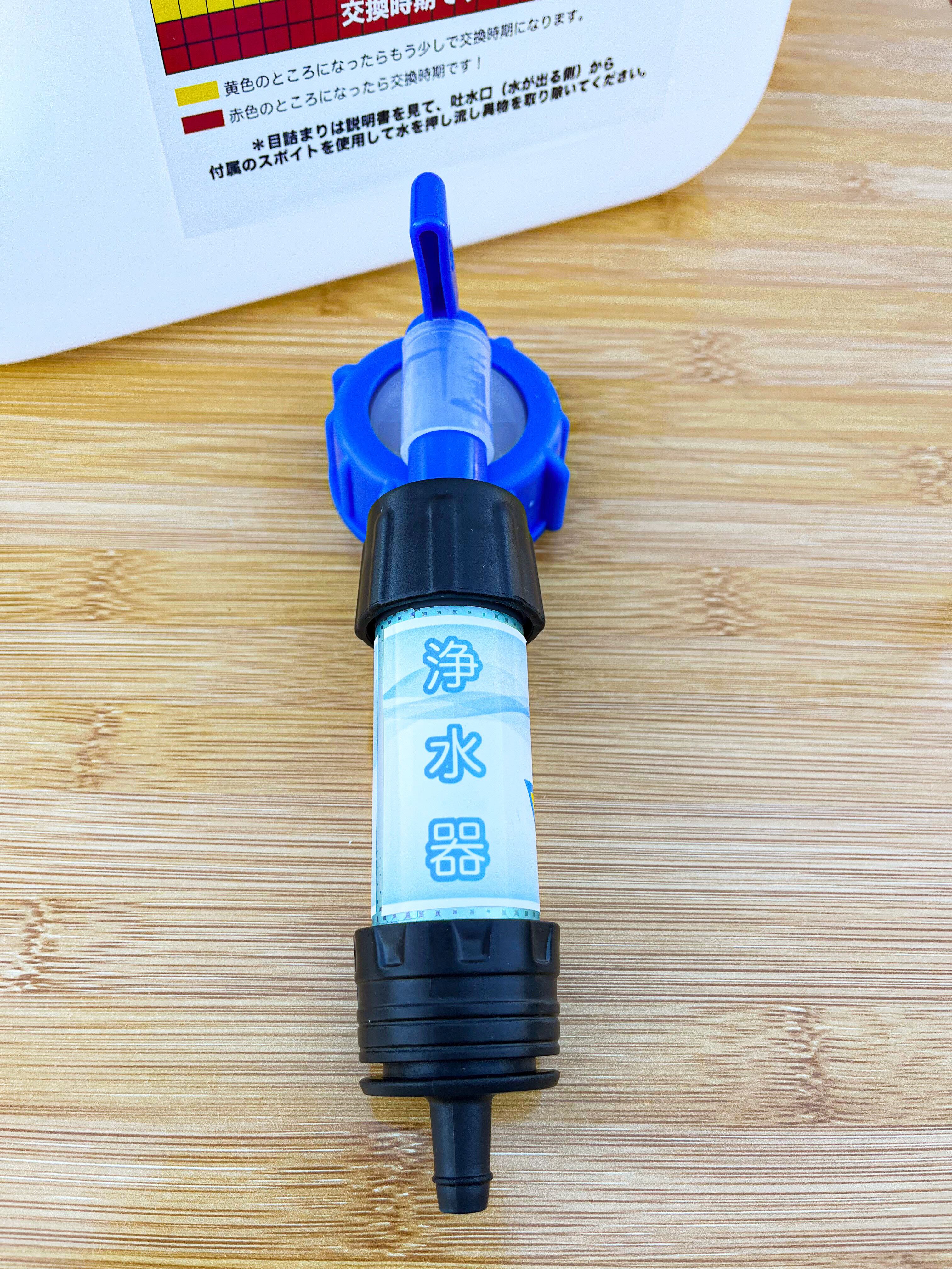 減災防災クリエイターが開発した新型大容量非常用浄水器シングルはポリタンクから直接水を浄水器に送ることができる一体型コック付き!